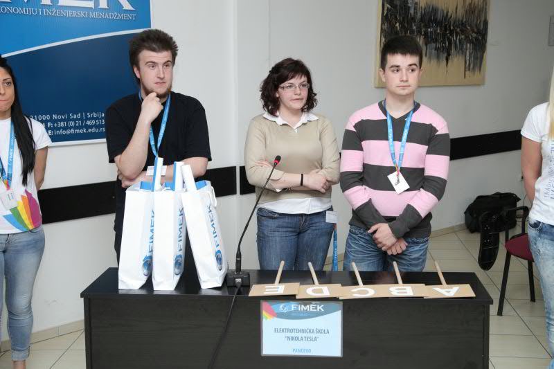Nagradu za osvojeno prvo mesto uručio je zamenik Pokrajinskog sekretara za obrazovanje, upravu i nacionalne zajednice mr Mato Groznica. Drugu nagradu uručio je Radenko Spremić, direktor MK Commerce. Treću nagradu uručio je prof. dr Dragan Soleša, dekan Fakulteta za ekonomiju i inženjerski menadžment. Četvrtu nagradu uručio je Branislav Maričić ispred edukativnog centra Memorija. Specijalnu nagradu osvojenu kroz nagradnu igru na Facebook mreži koju je osvojila Ekonomsko – trgovinska škola „Paja Marganović“ iz Pančeva uručio je prof. dr Marko Carić, dekan Pravnog fakulteta za privredu i pravosuđe. Svim predstavnicima privrede koji su podržali takmičenje „FIMEK nagrađuje znanje“ uručeni su pokloni i zahvalnice od strane prof. dr Maje Ćirić, prodekanice za nastavu na Fakultetu za ekonomiju i inženjerski menadžment.