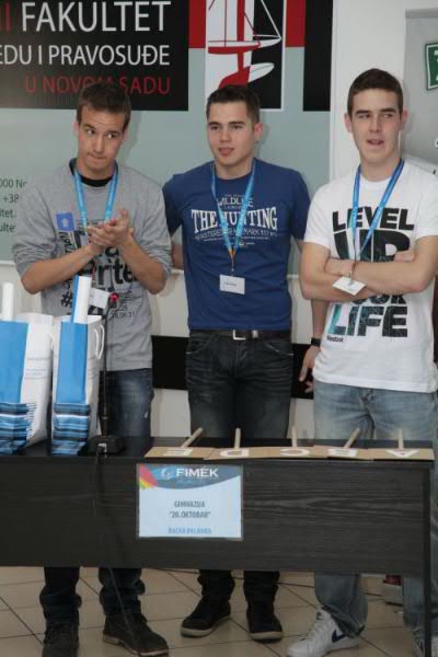 Nagrade su koncipirane tako da se nagradi znanje i budućim studentima pruži motiv za dalje obrazovanje. Stoga su, pobednici, maturanti Gimnazije „Stevan Puzić“ iz Rume dobili putovanje u neku od evropskih prestonica, po njihvom izboru, kao i popust na školarinu u vrednosti od 40% na Fakultetu za ekonomiju i inženjerski menadžment u Novom Sadu, odnosno Pravnom fakultetu za privredu i pravosuđe u Novom Sadu, takođe po izboru pobedničke ekipe. Pored navedenog pobednici su dobili i knjige izdavačke kuće „Mate“, kao i knjige izdavačke kuće „The English Book“. Takođe, pobednici su dobili i vaučer za 50% popusta na kurs Brzog čitanja od edukativnog centra Memorija, kao i vaučere sa 100 dolara popusta na program „Summer Work and Travel USA“ za sezonu 2015. godine od agencije Work and Travel group Novi Sad. Drugoplasirana ekipa, maturanti Elektrotehničke škole „Nikola Tesla“ iz Pančeva su, pored popusta na školarinu u vrednosti od 30% na FIMEK-u ili Pravnom fakultetu za privredu i pravosuđe, dobili i vikend na Jahorini koji daruje Ski Savić, knjige izdavačke kuće „The English Book“. Pored navedenog, druga nagrada su i vaučeri za popust od 20% za bilo koji od 28 jezika u Centru za strane jezike Manhattan, kao i vaučeri u vrednosti od 1000 dinara u frizersko kozmetičkom salonu Luminus. Treća nagrada, 20% popusta na školarinu , takođe, na jednom od pomenuta dva fakulteta po izboru maturanata, Gepard patike po izboru, vaučeri za popust od 10% za aranžmane turističke agencije Oktopod travel, knjige izdavačke kuće The English Book, vaučeri za usluge Frizersko-kozmetičkog salona Luminus, kao i vaučeri za popust od 20% koje daruje Centar za strane jezike Manhattan i ručak ili večera za tim u restoranu Rosetto, otišla je u ruke maturantima Ekonomsko – trgovinske škole „Paja Marganović“ iz Pančeva. FIMEK je pripremio i utešnu nagradu za ekipu Gimnazije „20. oktobar“ iz Bačke Palanke koji su osvojili četvrto mesto i to vaučere za popust od 20% koje daruje Centar za strane jezike Manhattan i vaučere za popust od 10% za aranžmane turističke agencije Oktopod travel.