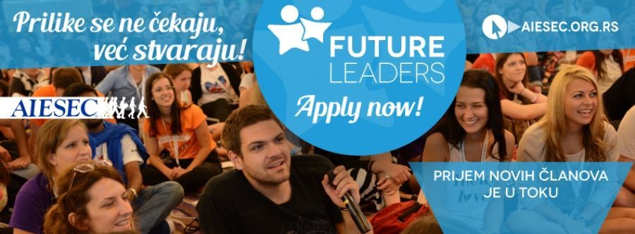 Početak nove godine fakulteta znači i vreme za nove odluke u vezi tvoje budućnosti, s toga studentska organizacija AIESEC u okviru "Future Leaders" programa sprovodi prijem novih članova sa porukom - "Prilike se ne čekaju, već stvaraju". AIESEC u Srbiji već 60 godina stvara mlade ljude sposobne da pozitivno utiču na okolinu. Kroz aktivno uključivanje studenata u rešavanje društvenih problema kroz organizovanje programa stručnih i volonterskih praksi, kao i različitih projekata i konferencija, studenti imaju prilike da steknu iskustvo, prevaziđu svoje granice i iznenade sebe saznanjem o mogućnosti ličnog razvoja. Internacionalni duh organizacije kao i povezanost sa koorporativnim sektorom omogućava studentima mrežu kontakata, a konkretan rad u timu ih čini spremnijim da se jednog dana lakše snađu u realnom poslovnom okruženju.