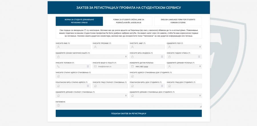 Molimo da odaberete odgovarajuću formu za registraciju spram svog statusa. Studenti takođe mogu izvršiti registraciju odlaskom na glavni link studentskog servisa: https://student.fimek.edu.rs gde mogu kliknuti na dugme "registruj se”. Molimo sve studente da u narednih 7 dana izvrše registraciju.